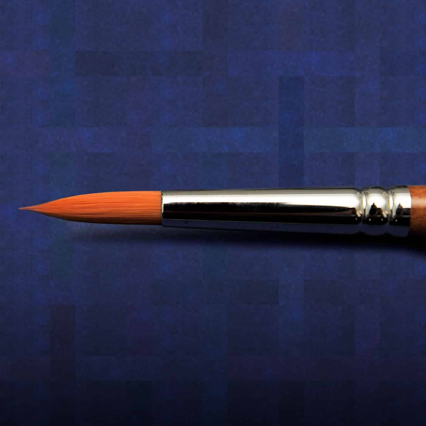 Akvarelpensel af kunstmårhår, trukne ”nysølvrør”, nøddebrunt lakeret træskaft. Danner fin spids, prima kvalitet med lang holdbarhed. Er også velegnet til vandfortyndbare silke-, porcelæns- og acrylmalinger.