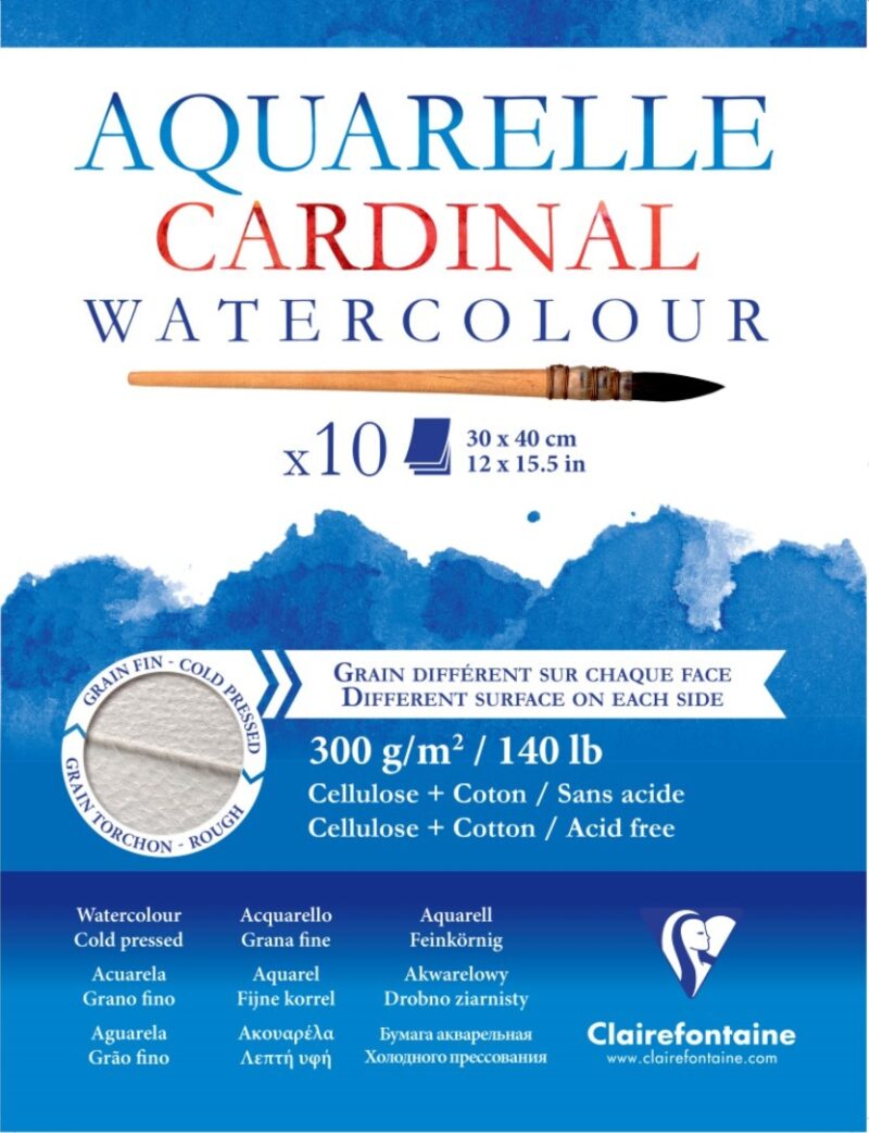 Clairefontaine Aquarelle Cardinal Akvarelblokke 300g. Cellulose og bomuld, Fin og grov korn på hver side – kold presset, 10 ark pr. blok.