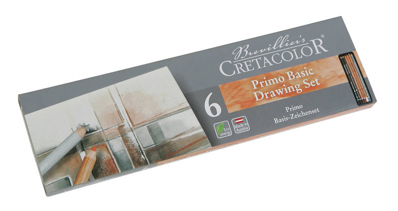 Cretacolor Basic Sættet består af et starter sortiment af skitse og tegne blyanter (Sanguine, Sepia, White Pastel, Charcoal, Nero) og en grafit Aquarell 4B.