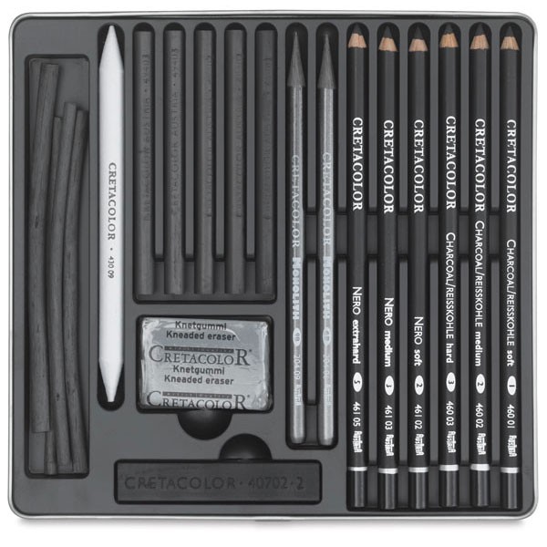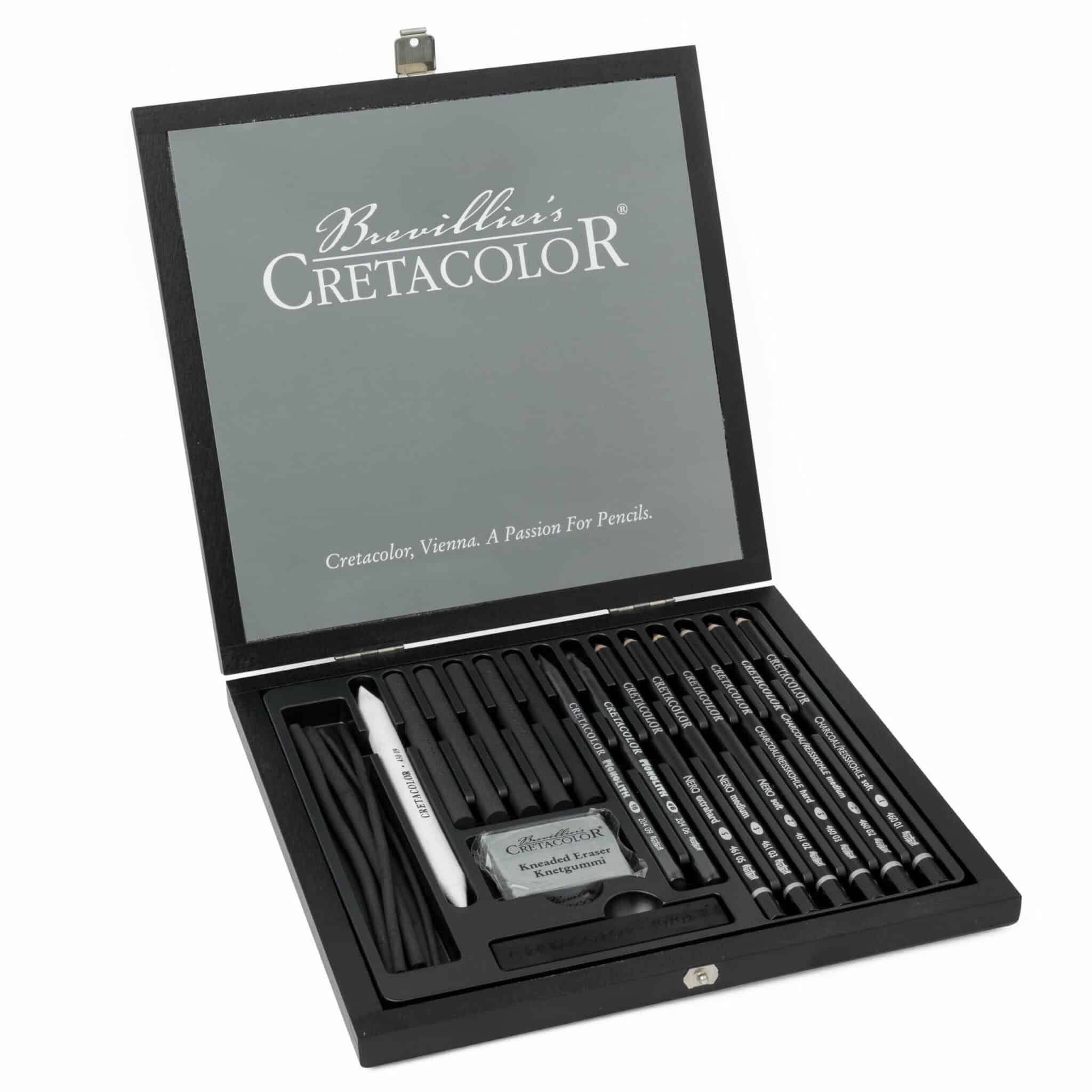 Cretacolor Black Box Kultegnesæt med 20 dele. Indeholder kul, grafit, Nero-blyanter, viskelæder og papirblender, alt til skitsering og tegning.