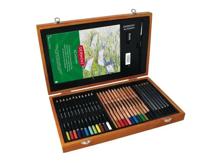 Derwent Academy Wooden Box med 27 dele i deluxe trækasse. Indeholder blyanter, farver og tilbehør.