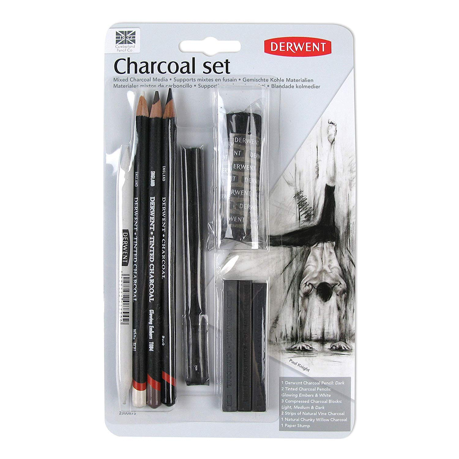 Derwent Mixed Media Charcoal sæt, 1 kul blyant, 2 x farved kul blyant, 3 x compimerede kul blokke, 2 x naturlige kul pinde og en naturlig tyk kulpind af pil og en papir pen.