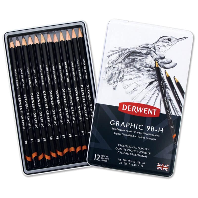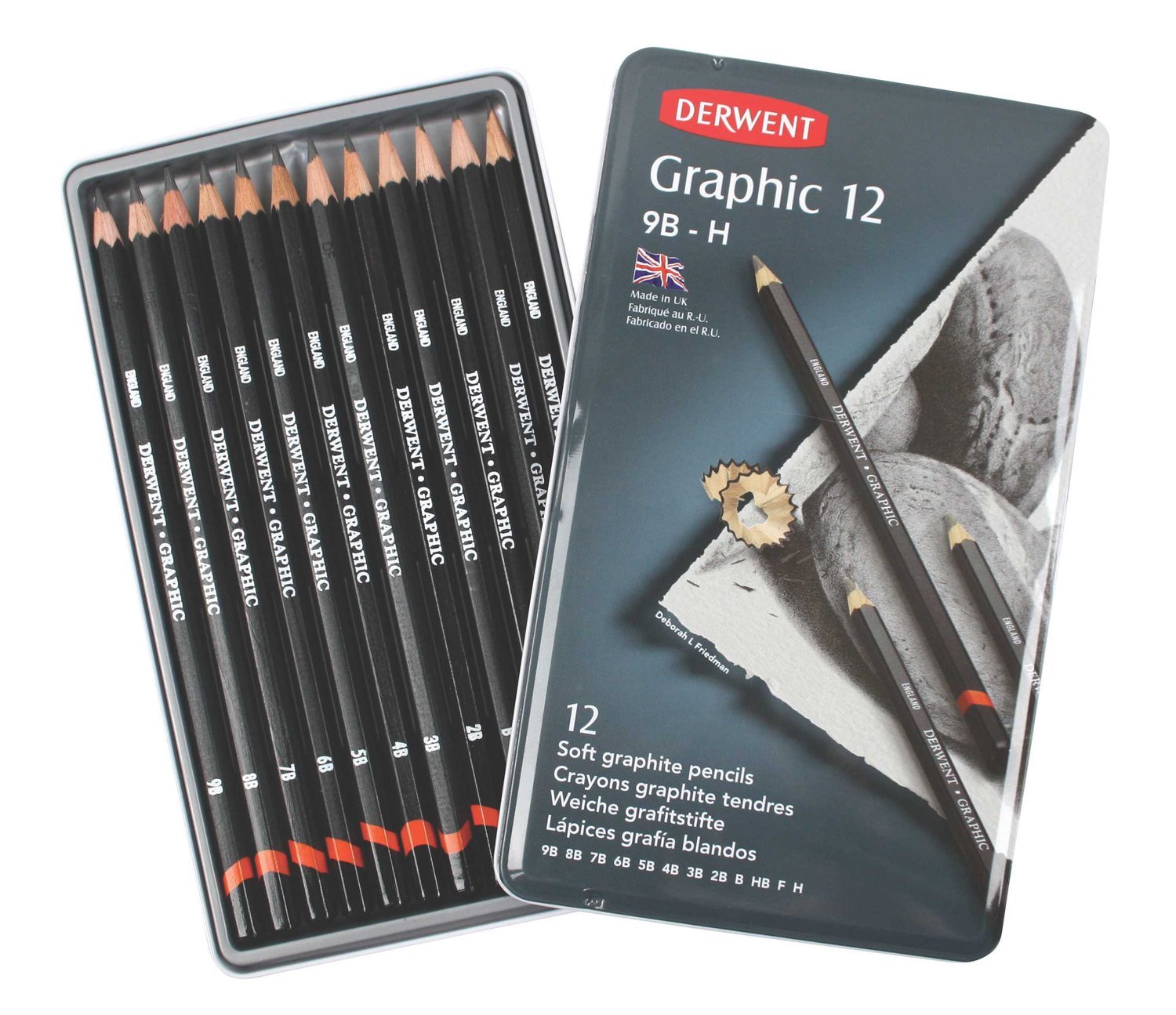 Derwent graphic soft sæt er produceret i et komplet sortiment af 20 grader fra 9B til H. Blyanterne er robuste, og grafitten er ensartet, de er Superb til blanding og udtværing.