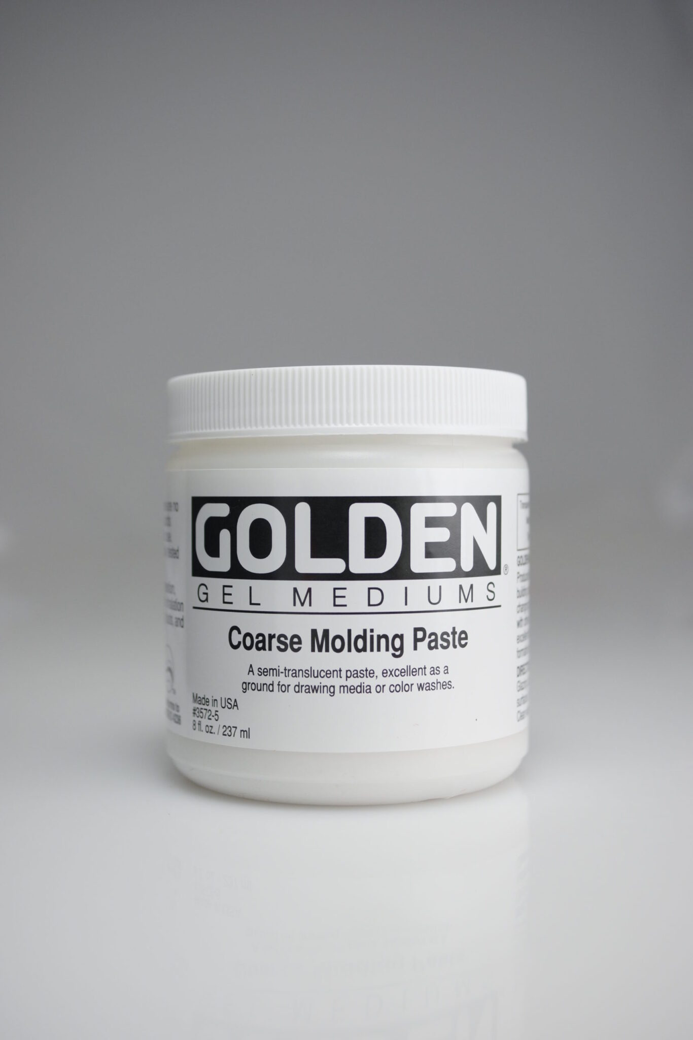 Golden Coarse Molding Paste – et tykt medium i en varm hvid farve der er gennemsigt i op til 3mm. tørrer op som en hård overflade, der er stiv men fleksibel og har en film overflade som fint sandpapir. Godt til både våde og tørre efterbehandlinger. Mix med GOLDEN Fluid Acrylics eller Heavy Body Acrylics for at skabe en maling der fæles tæt og som er meget velegnet til toppe og tørrer med en mat eller satin skær og en finkornet overflade.