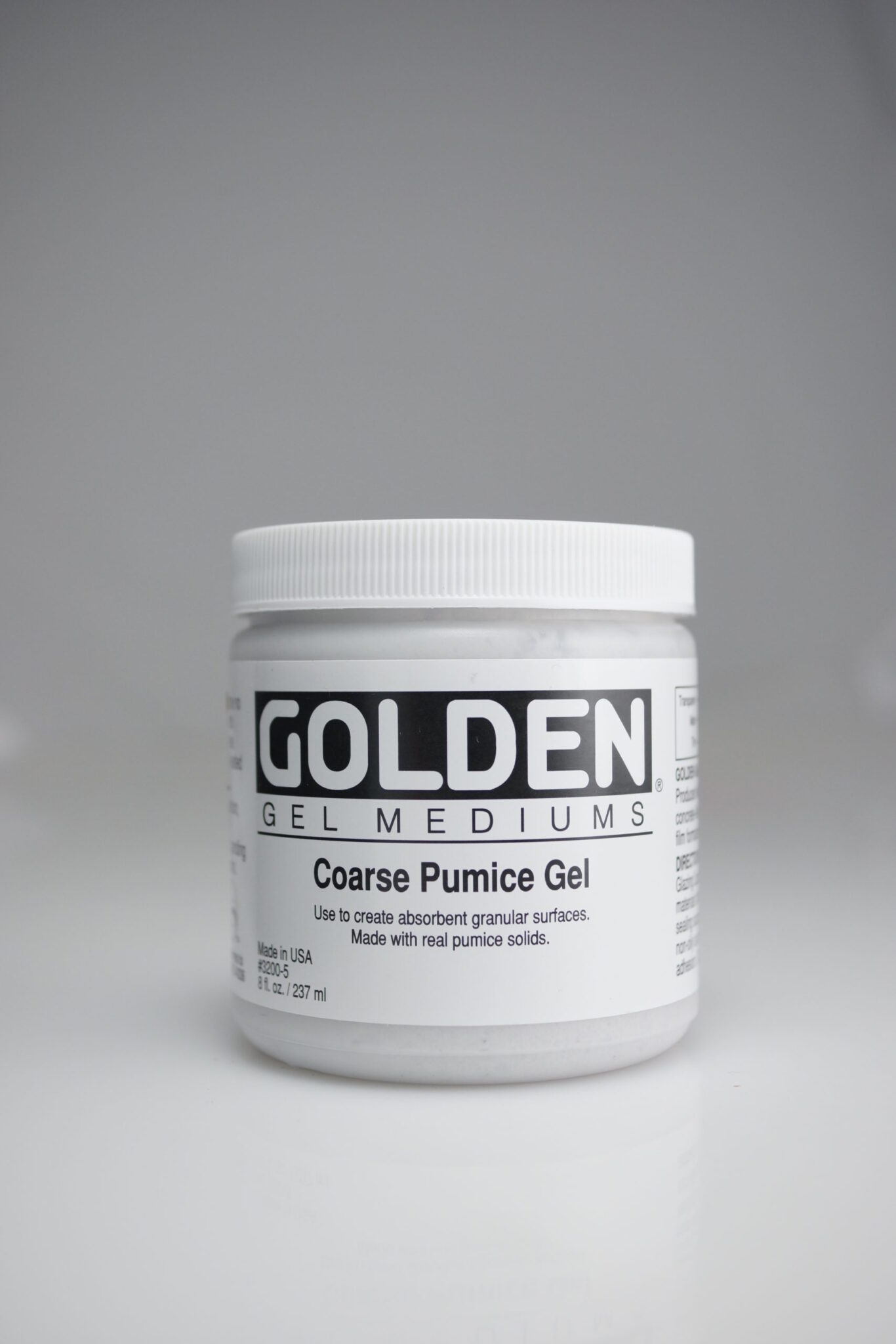 Golden Pumice Gels giver forskellige grader af grynet struktur, som giver en hård overflade. Graden af smidighed og vedhæftning kan øges ved at man blander dem med andre GOLDEN gels og malemidler. Pumice Gels og GOLDEN acrylfarver arbejder godt sammen. Coarse Pumice Gel og Extra Coarse Pumice Gel giver overfladen en struktur, der har karakter af cement.