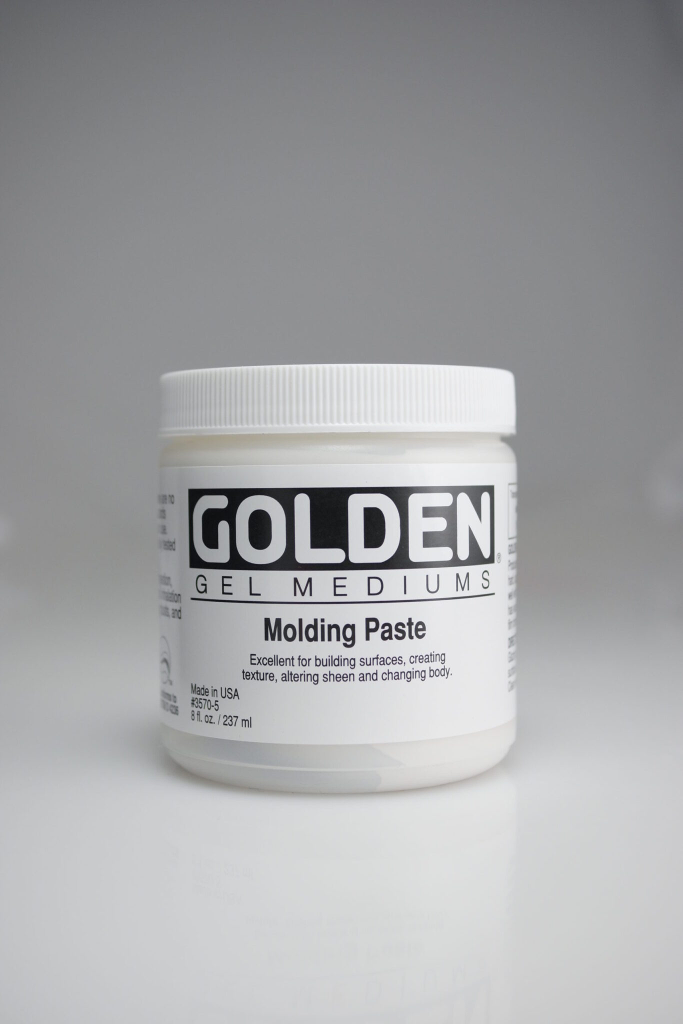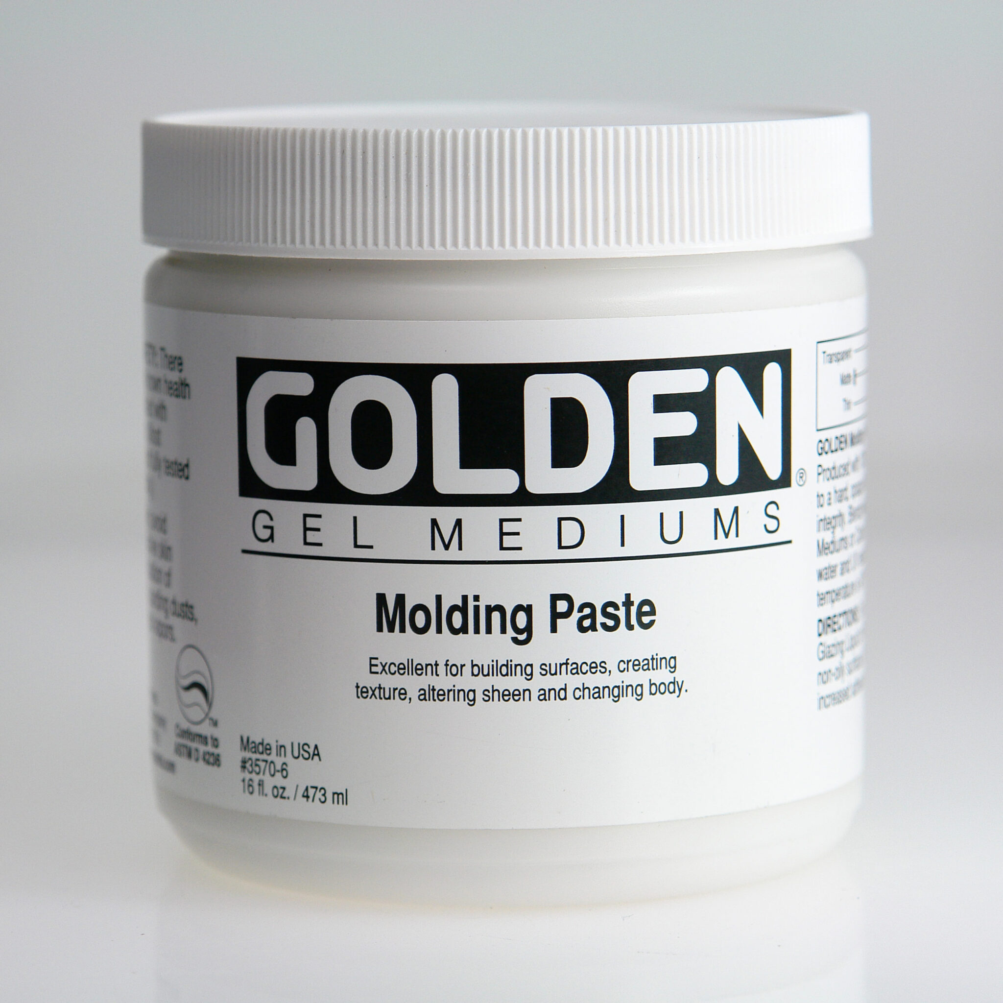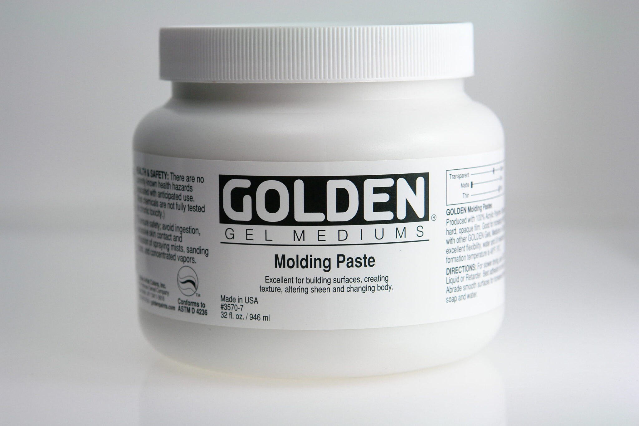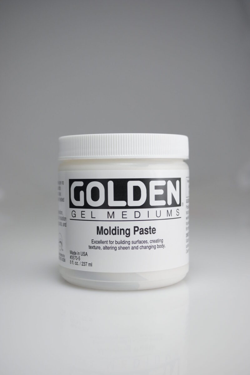 Golden Molding Paste tørrer op til en hård, dækkende overflade. Den er stadig smidig, men dog mere stiv end Gels. Den er så fast i strukturen, at det er muligt at bygge reliefagtige overflader op.