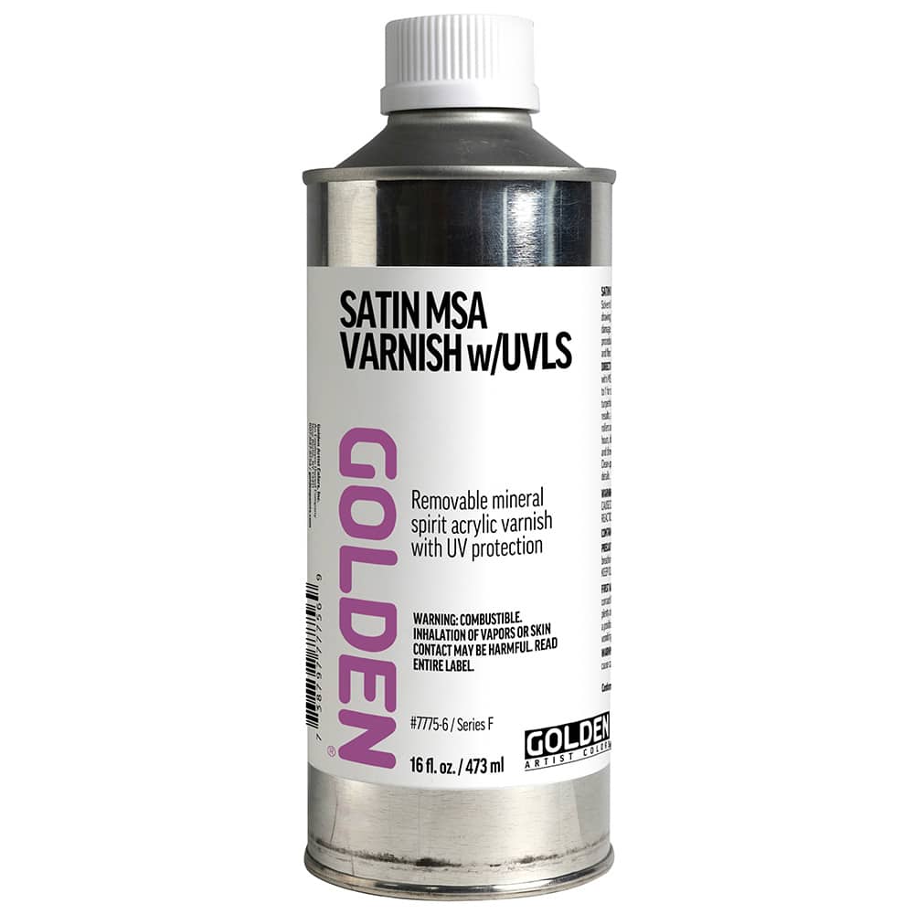 Golden Satin MSA Varnish w/UVLS er en aftagelig akrylharpiks-fernis, der giver en jævn satinfinish og effektiv UV-beskyttelse. Fernissen beskytter maleriet mod snavs, slid og falmning og kan fjernes uden at beskadige den underliggende overflade.