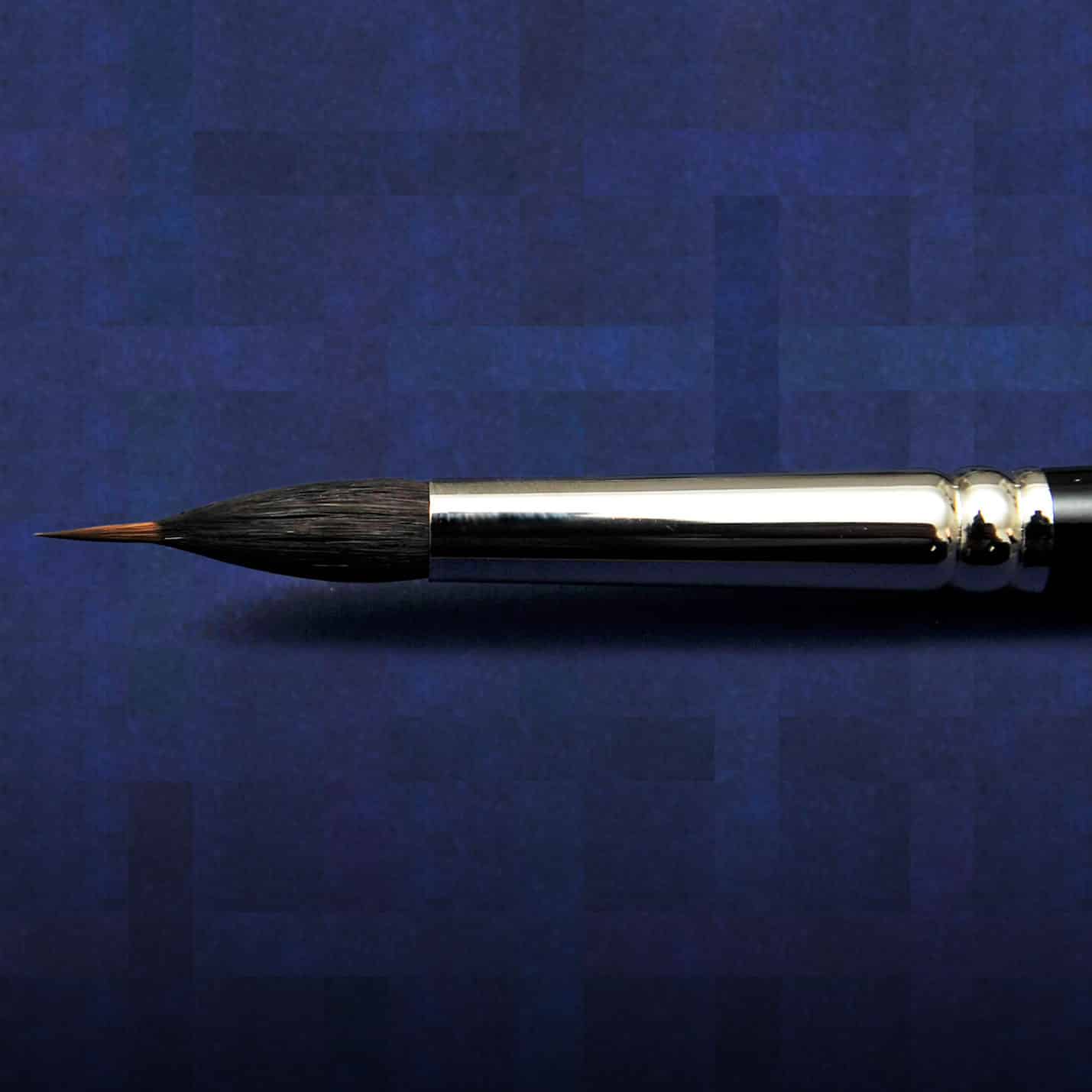 Rund spids mårhårspensel som str. 2, omgivet af egernhår, der kan opsuge ekstra meget materiale. ”ny sølvrør”, matsort lakeret skaft.