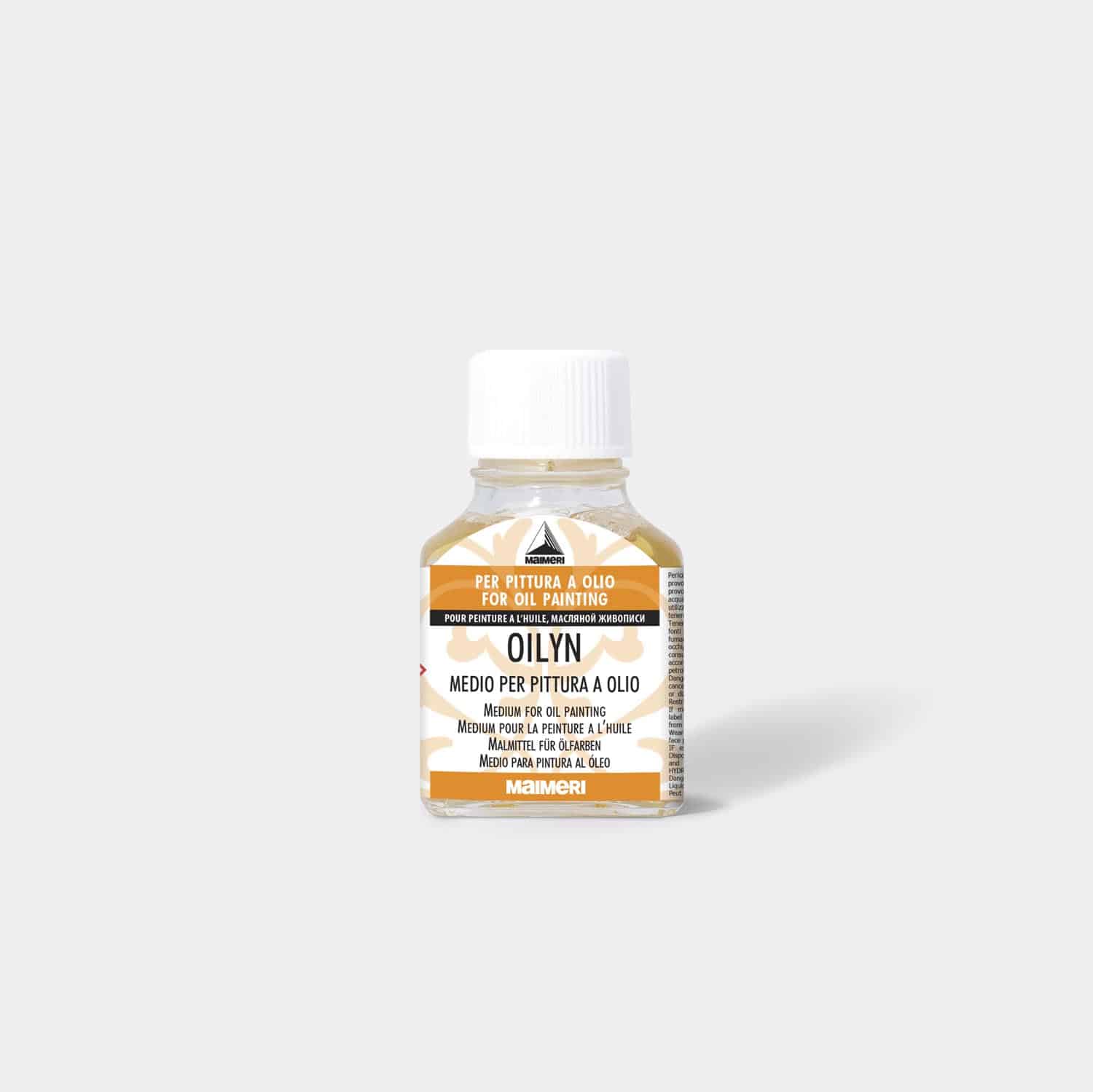 Maimeri Oilyn er et halvblank, ravfarvet medium man bruger til fortynding af olimaling. Den får maling til at flyde nemmere og penselstrøg for en blødere struktur.