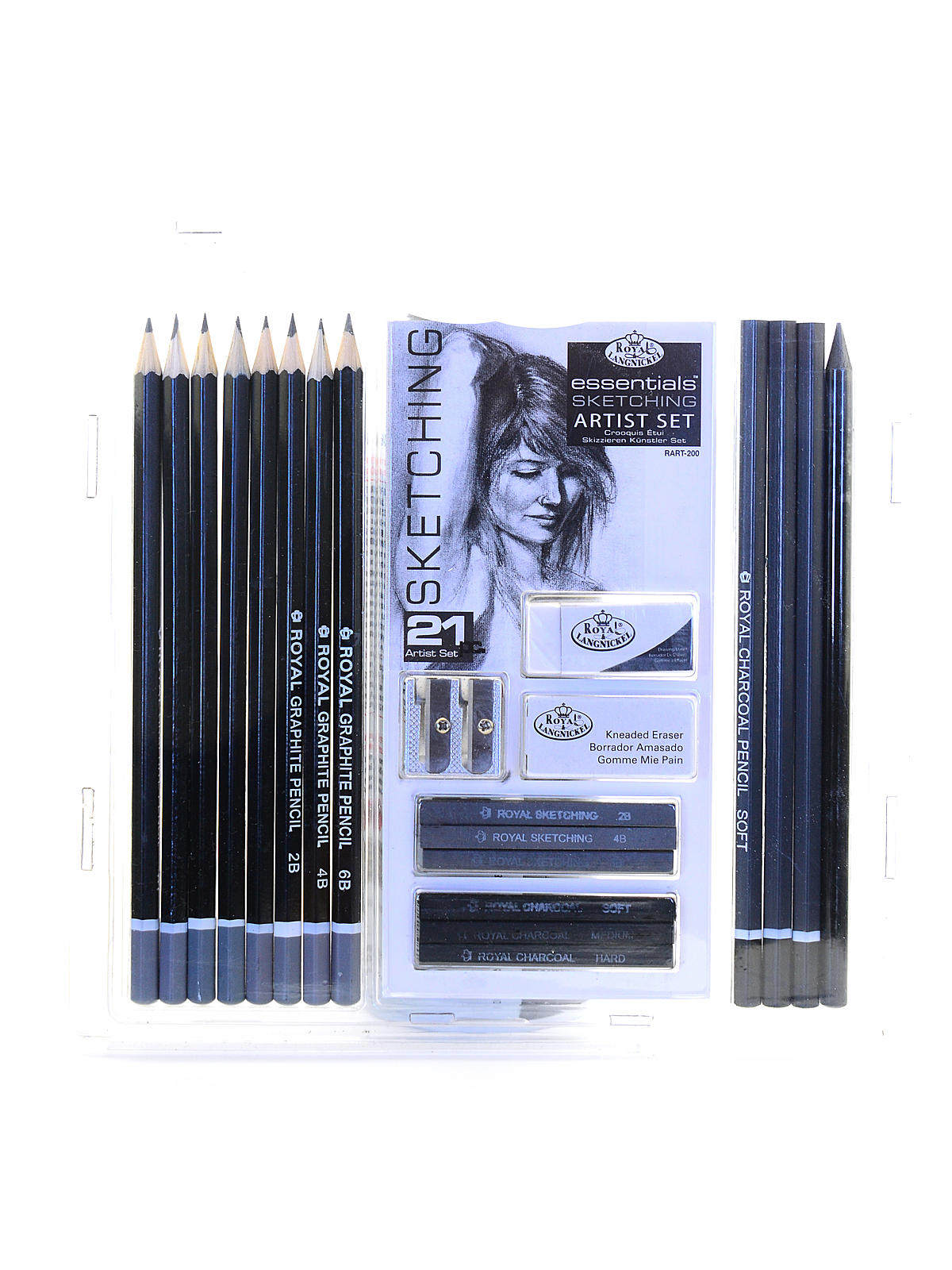 Royal Langnickel Sketching sæt med 8 grafit (4H, 2H, H, HB, B, 2B, 4B, 6B), 4 kul blyanter, 3 skitse pinde, 3 kul, et hårdt og et bløde viskelæder og en blyantspidser.