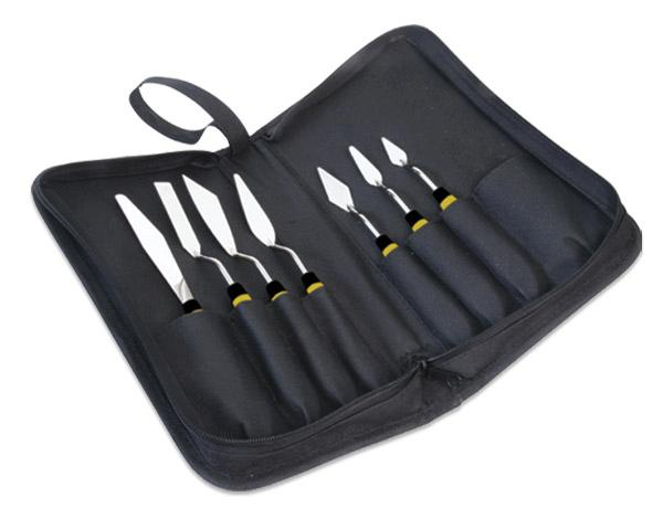 Palettekniv sæt fra system 3, indeholder 7 forskellige paletteknive udført i en god blanding af funktionalitet, kvalitet og elegance i smart stof taske. kan andvendes til en lang række maleteknikker