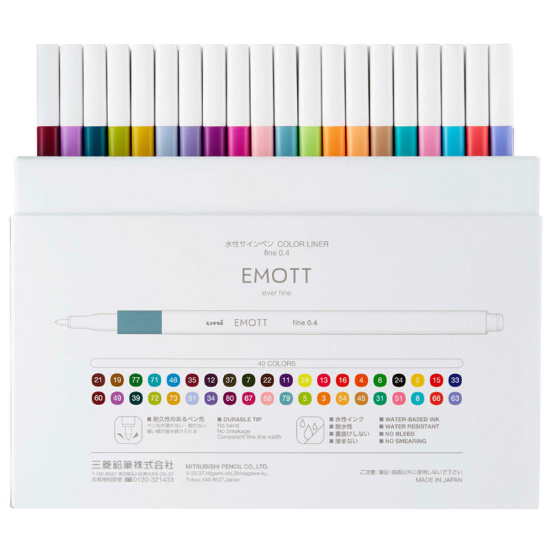 Uni Emott fineliner. sæt med 40 stk. De har 0,4mm linie brede som forbliver kontant. Vandresistent, lysægte blæk.