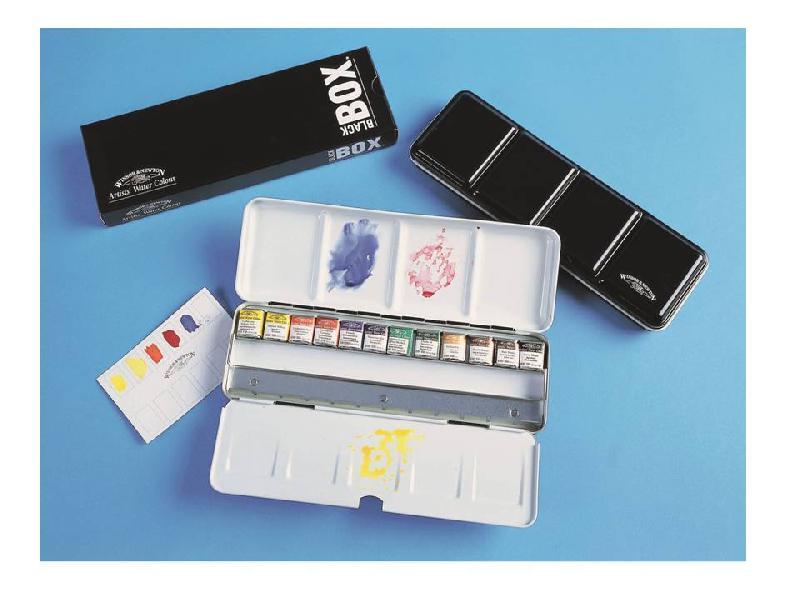 En sort æske af letmetal, indeholdende 12 assorterede halvtabletter med Artists’ Akvarelfarver.