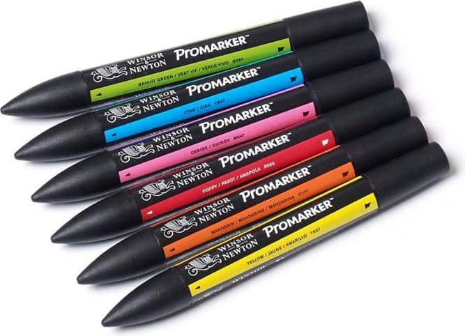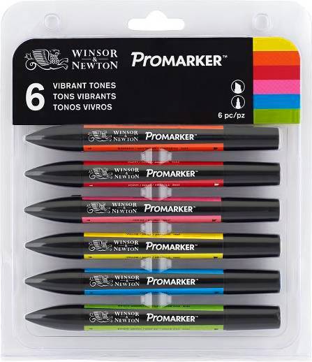 Winsor & Newton Promarker 6 stk sæt Vibrant Tones med alkoholbaseret permanent blæk og dobbeltspids til illustration, design og farvelægning..
