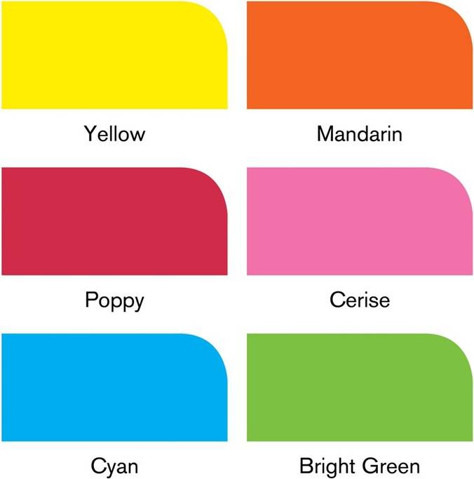 Farver med Yellow, Mandarin, Poppy, Cerise, Cyan, Bright Green.
