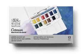 Winsor & Newton Cotman Akvarel Palette Pocket Sæt, med pensel, palette, og 12 half pan farver : Payne’s Gray, Lamp Black, Chinese White, Lemon Yellow Hue, Alizarin Crimson Hue, Ultramarine, Burnt Sienna, Yellow Ochre, Sap Green, Viridian Hue, Turquoise, Dioxazine Violet