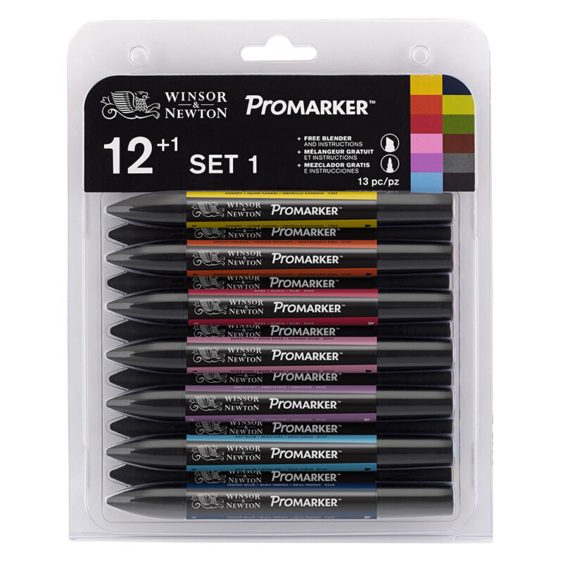 Winsor & Newton Promarker sæt 1 med 12 farver og en blander. Farverne er : Canary, Bright Orange, Ruby, Rose Pink, Amethyst, Sky Blue, Indigo Blue, Lime Green, Forest Green, Henna, Cool Grey 4, Black.